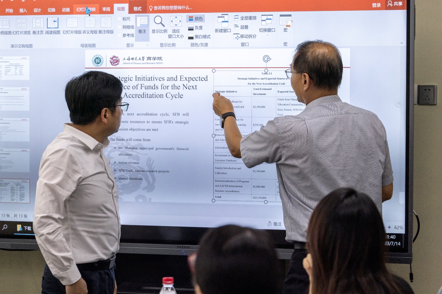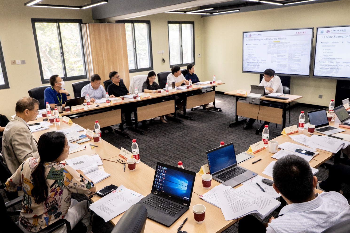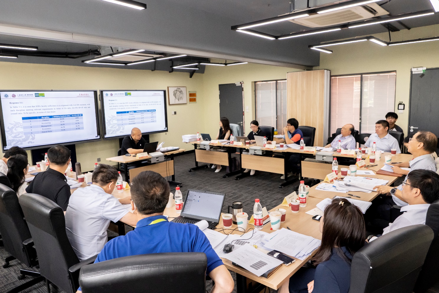 当天上午9:00,林君维教授与上海师范大学商学院党委书记朱惠军、院长刘江会、副书记龚秀芳、副书记兼副院长周芸、副院长王周伟、副院长赵红军、副院长姚亚伟、行政总监石雄、参与AACSB认证相关工作的教职员工等人于商学院六教D座203会议室开启了此次访视的会议。此次访视期间的7场会议,均以英语作为主要沟通语言,每场会议期间所展示的幻灯片、iSER初稿等文件亦为全英文形式,模拟了AACSB国际认证的官方访视的情景。