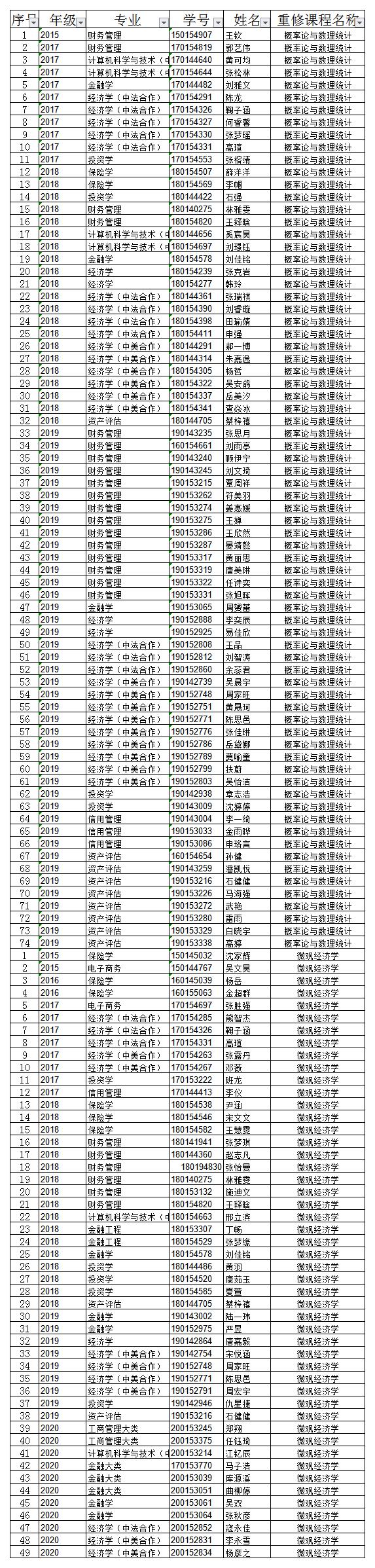 2020-2021学年第2学期概率论与数理统计、微观经济学周末线上重修班报名名单