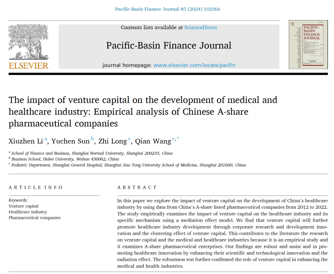 论文核心内容:该论文基于2012-2022年中国A股医药上市企业数据,实证检验了风险投资对医疗健康产业的影响及其具体机制,研究结果表明:风险投资流入医药企业提升了医药企业科技创新以及医疗健康产业辐射效应,并通过科技创新和辐射效应两种机制来促进医疗健康产业整体发展,稳健性检验进一步证实了风险投资提升医疗健康产业的作用。