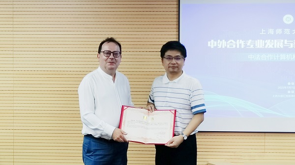 国际事务部主任唐丽老师主持了会议开幕式及聘任仪式。主持工作副院长刘江会教授分别为上海交大巴黎高科卓越工程师学院法方院长FREDERIC TOUMAZET教授颁发了上海师范大学商学院计算机(中法合作)专业顾问聘书、为SYSMEEK咨询公司总经理PHILIPPE DUONG颁发了上海师范大学商学院中外合作专业业界导师聘书,以此表彰这两位外教多年来为我院中外合作办学项目的教学工作所做的突出贡献,并期待他们继续为我院中外合作专业的发展助力。两位受聘者发表了感言,并表示非常乐意为我院中外合作项目贡献力量。