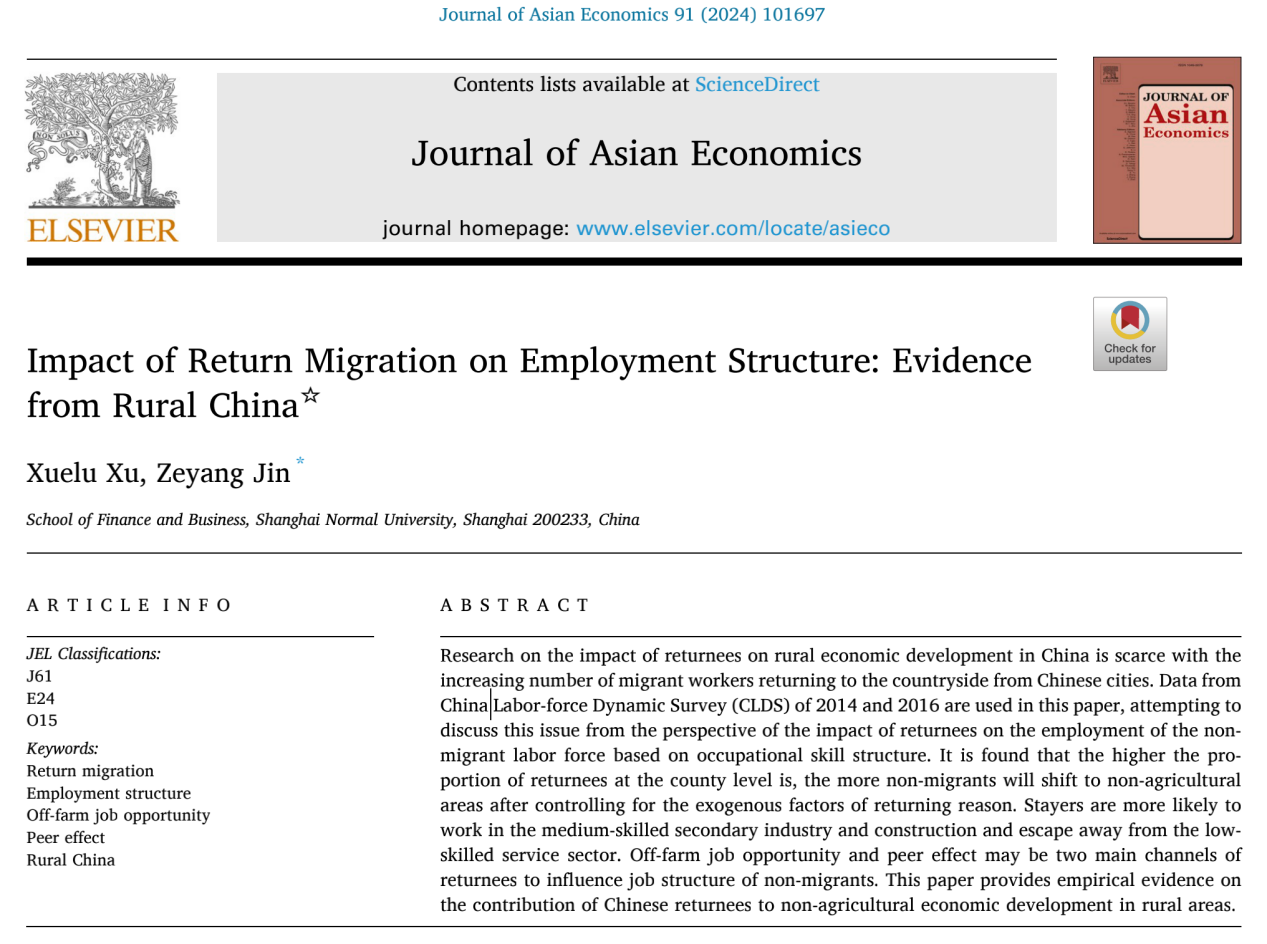 我院经济系许薛璐博士作为第一作者与金则杨博士的合作论文“Impact of Return Migration on Employment Structure: Evidence from Rural Chin”在Journal of Asian Economics期刊发表。该期刊是国际学术界公认的经济学领域知名期刊,2022-2023影响因子2.9,为JCR的Economics, Econometrics and Finance领域的SSCI二区期刊。