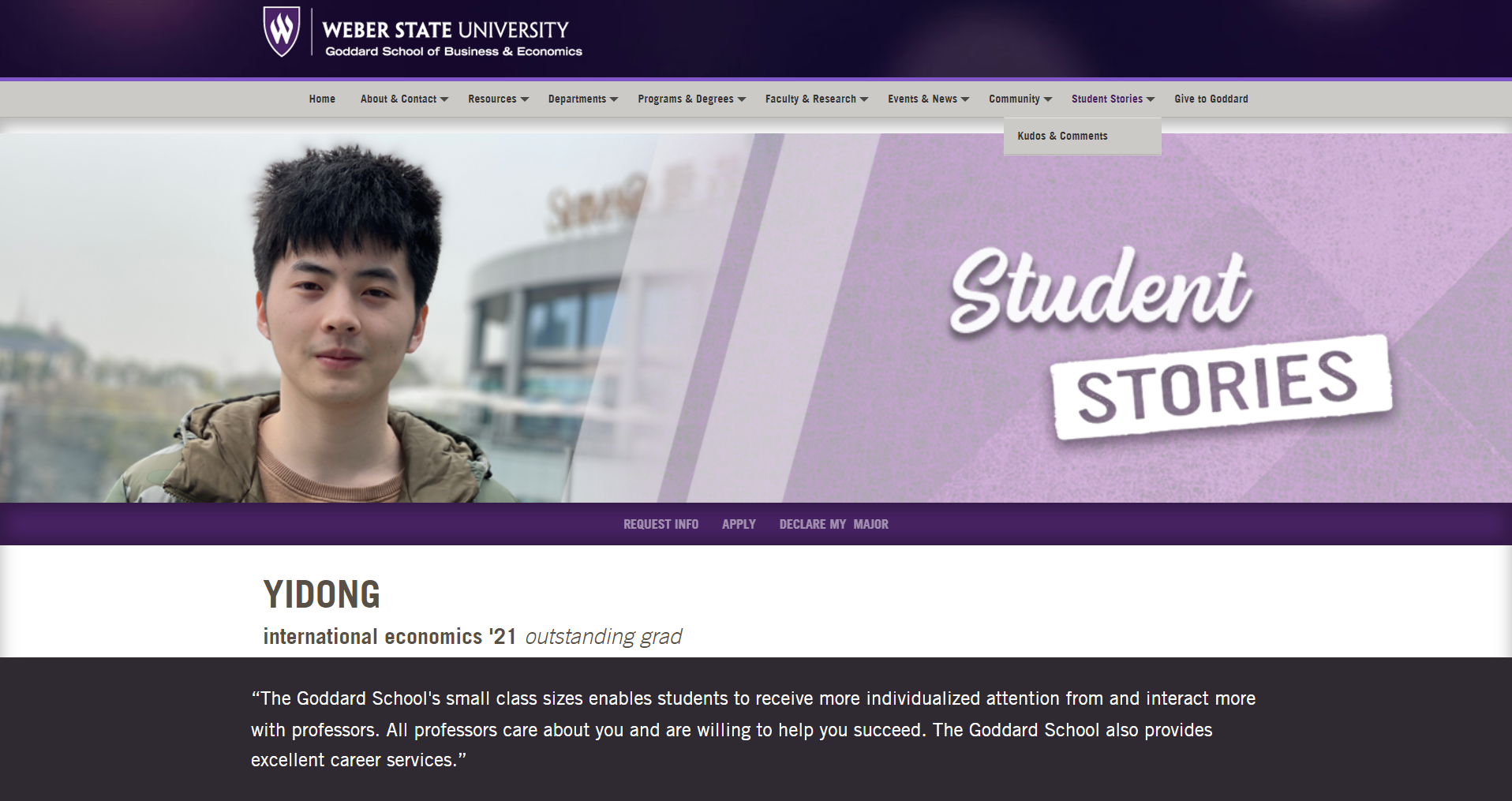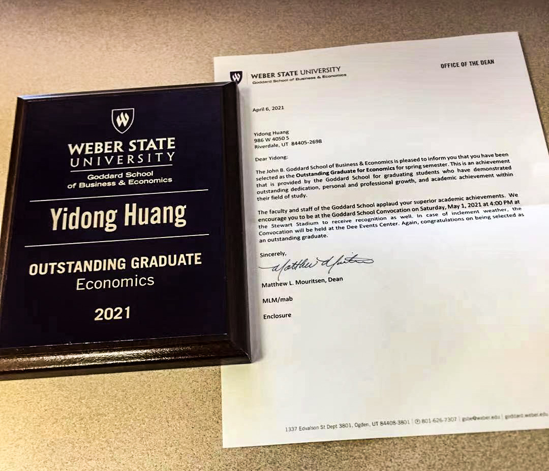 近日,从大洋彼岸传来好消息,我院2017级中美经济学生黄益东喜获2021年美国韦伯州立大学“杰出毕业生”荣誉。黄益东于2019年秋季参加我院与美国韦伯州立大学合作的2+2“国际经济”双文凭项目,于今年顺利毕业并获得上海师范大学商学院与美国韦伯州立大学本科双学位。