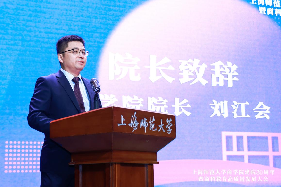 商学院院长刘江会致辞。他用24个字“时造之恩,铭感于心”、“众力共铸,铭谢于心”、“砥砺奋进、铭刻于心”表达了全院师生员工在建院30周年时的心声。商学院的发展离不开学校党委、全体师生员工、海内外校友和社会各界的鼎力支持。站在新的历史起点上,刘江会指出学院将在“荣誉源自责任”的价值观的引领下、在使命驱动下,围绕九大战略举措(PRIDE-SHIP),奋楫扬帆,推动承载着所有商院人梦想的荣耀之舟,破浪前行,为打造一所具有上海师范大学商学院禀赋特征,与上海卓越全球城市相匹配的高水平商学院而努力奋斗!