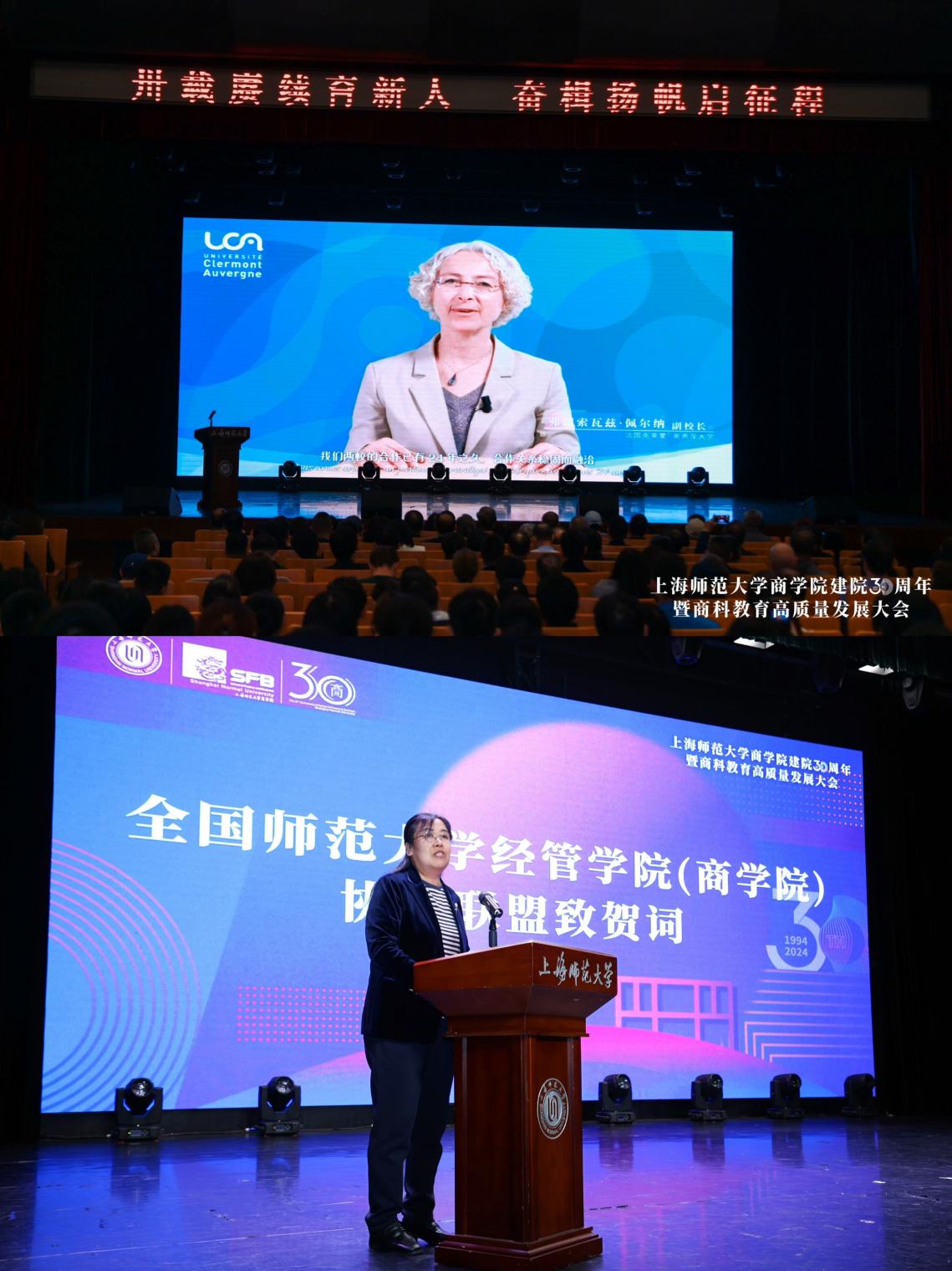 法国克莱蒙奥弗涅大学副校长弗朗索瓦兹·佩尔纳以视频的形式对商学院建院三十周年表示热烈祝贺。全国师范大学经济与管理学院(商学院)协作联盟副会长、东北师范大学经济与管理学院院长吕康银代表全国师范大学经管学院(商学院)协作联盟致贺词。同时,大会还收到来自外省市和上海二十余所兄弟院校发来的贺信。