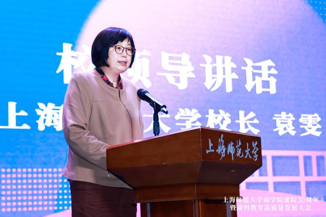 最后,校长袁雯作重要讲话。袁校长表示,商学院未来的发展要充分发挥好上海的区位优势和上海师范大学商学院的综合优势,持续做好打造具有师大禀赋特征的商科教育和服务上海地方经济社会发展这两篇大文章。袁校长对商学院提出了三点期望:第一,坚守初心,培育英才。希望商学院能培养更多具有国际视野、创新精神和实践能力的商界人才。第二,科研铸魂,服务大局。希望商学院继续加强高水平科研团队建设在服务国家和区域经济社会发展中展现新作为、做出新贡献。第三,开放合作,彰显特色。希望商学院持续巩固国际化办学优势特色,为上海加快建成具有世界影响力的社会主义现代化国际大都市贡献力量。