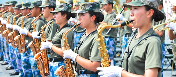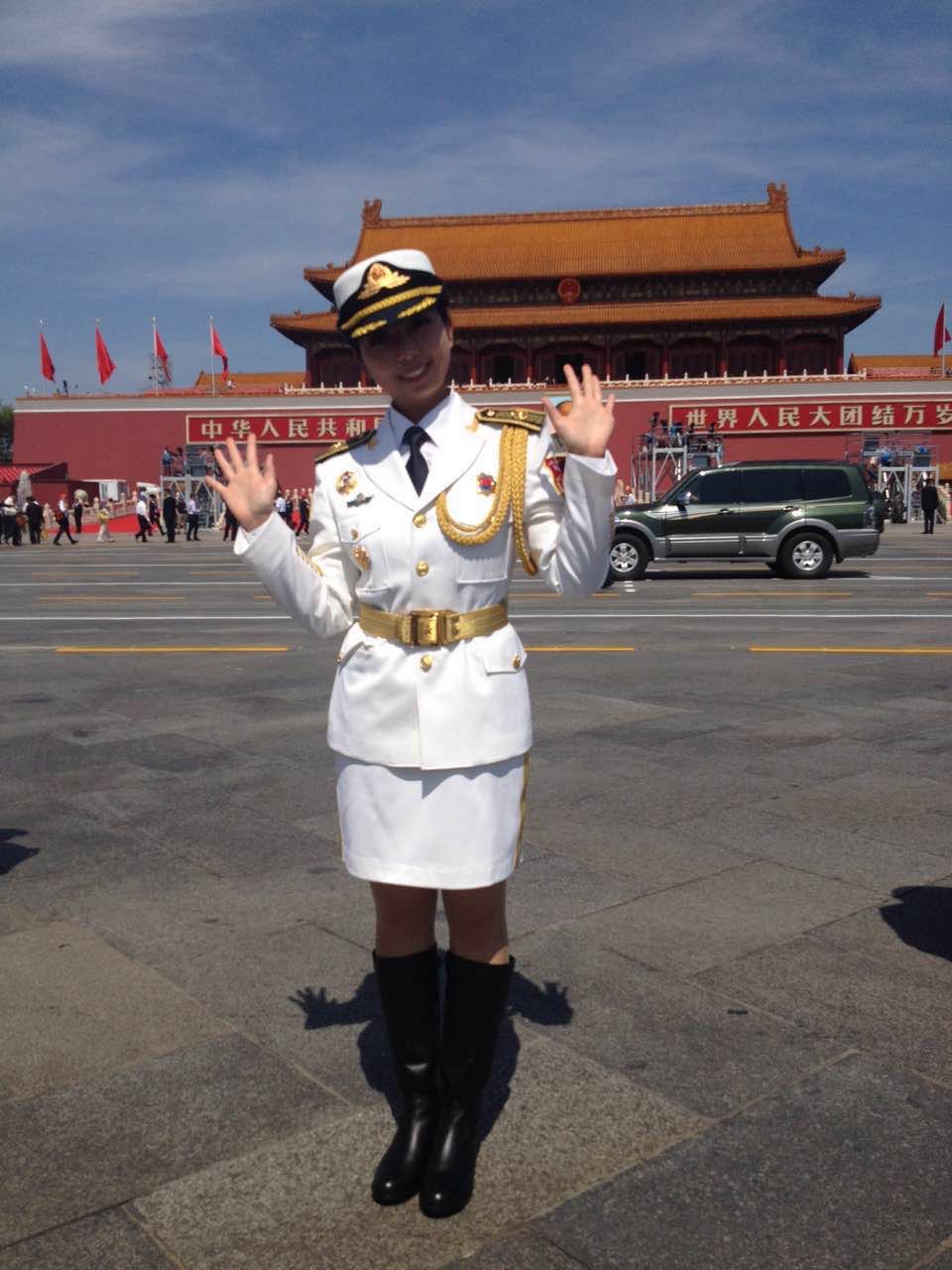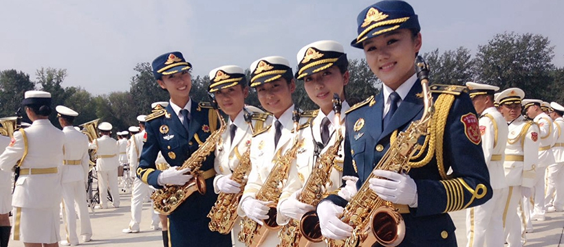 奚青云是我院2010级法语专业的学生(上图右二),2013年以大学生身份应征入伍。在部队的这两年,奚青云积极参与连队训练,素质过硬,业务娴熟。作为70周年胜利日大阅兵的“十一大看点”之一,解放军联合军乐团首次出现女兵,与男兵一道指挥和演奏军乐的特殊编队方式。在千名规模的联合军乐团中,有100余名女演奏员参与完成此次军乐演奏任务。奚青云同学凭借高政治素质和高水平萨克斯演奏能力,通过乐器专业内容和政治素质等层层考核,从优秀演奏员中被选出参加集训,光荣地加入了联合军乐团这一支队伍。
