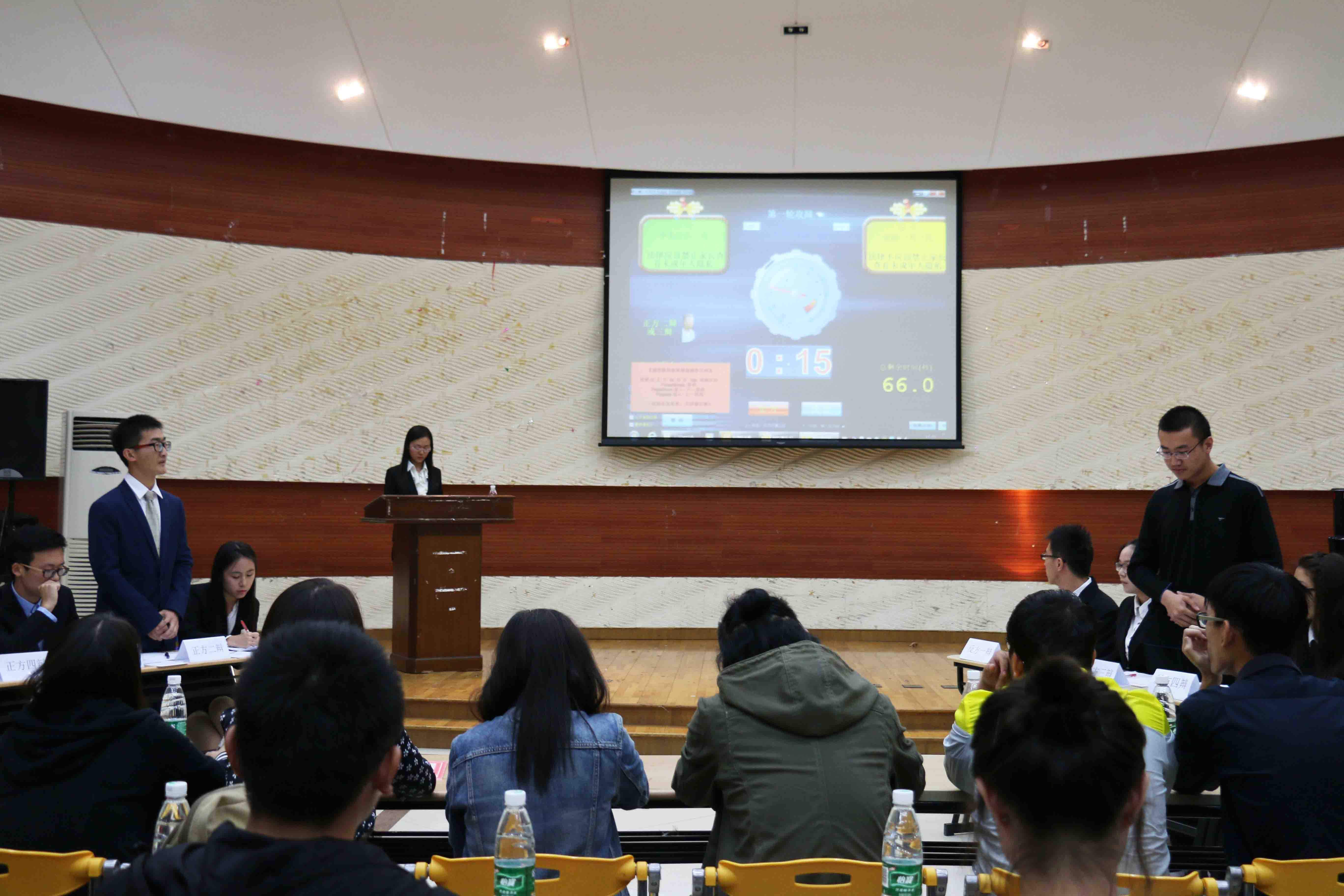 在幽默的小品表演过后,决赛之战正式打响。首先正反两方一辩分别针对辩题先后就所持观点进行开场陈词,两位辩手清晰的思路和巧妙准确的陈词立刻点燃了辩论现场的激情。随后,双方进入攻辩阶段,两方辩手你来我往,唇枪舌剑,步步紧逼,一度将辩论赛现场气氛推向了高潮,可谓是“群雄舌战展雄风,争锋相对辩天下”。而最后的总结陈词阶段,两方皆沉着应对,为此次辩论画上了完美的句号。比赛全程,双方辩手皆展现出自信的风采及超强的应变能力,频频引发场下阵阵掌声。