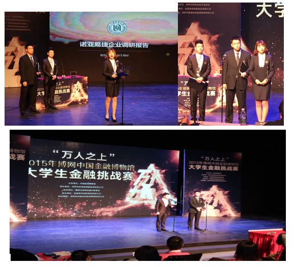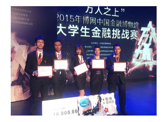 10月31日,由中国金融博物馆主办的2015“万人之上”中国大学生金融挑战赛总决赛在北京圆满落幕,由我校商学院13级金融工程专业龙鹏、李家璇、林铭辉,14级金融学廖志国和信用管理李绍如5名同学组成的上海师范大学商学院代表队获优胜奖,广东财经大学以微弱优势战胜南开大学获得冠军。