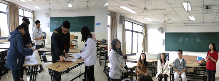 11月18日下午,商学院商务精英启航班系列活动之团队训练在奉贤校区第四教学楼举行,陈诗章老师和夏漪老师分别带领商院学生会成员在511和515室进行了一连串的团队合作游戏。