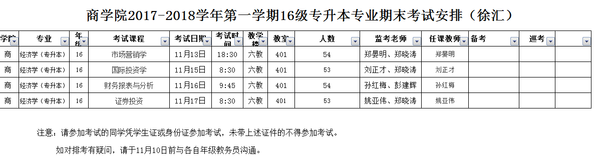 2017-2018学年第1学期2016级经济学专升本专业期末考试安排