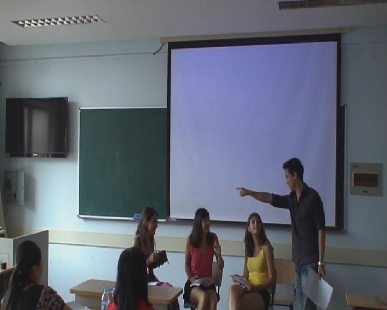 考试内容是汉语听说能力,而考试形式是小品表演。留学生们自由组合,或三人,或四人,把他们在上海日常生活的片段编成一个个小故事,用小品表演的形式展示他们在这一个学期的汉语学习后,如何把他们学到的汉语运用到上海生活、学习、娱乐的各个方面。