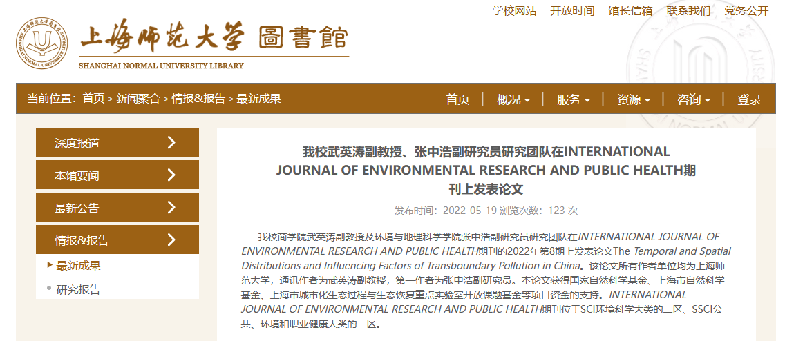 2022年5月19日,上海师范大学商学院图书馆在其新闻聚合中以“我校武英涛副教授、张中浩副研究员研究团队在INTERNATIONAL JOURNAL OF ENVIRONMENTAL RESEARCH AND PUBLIC HEALTH期刊上发表论文”为题,报道了我院武英涛副教授的最新研究成果。