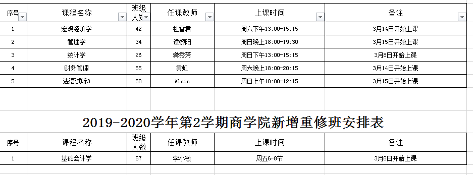 2019-2020学年第2学期新增课程重修班授课时间安排